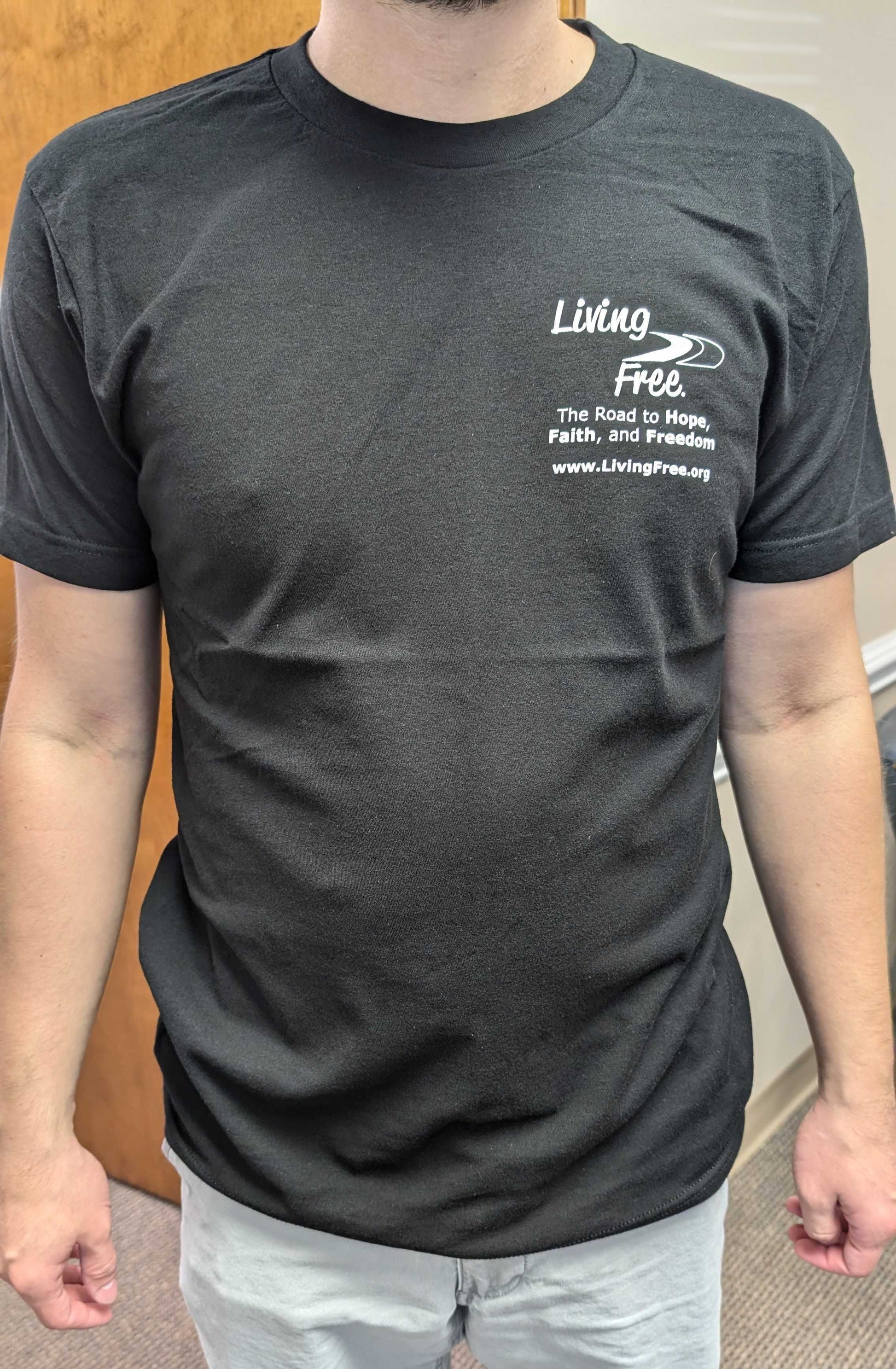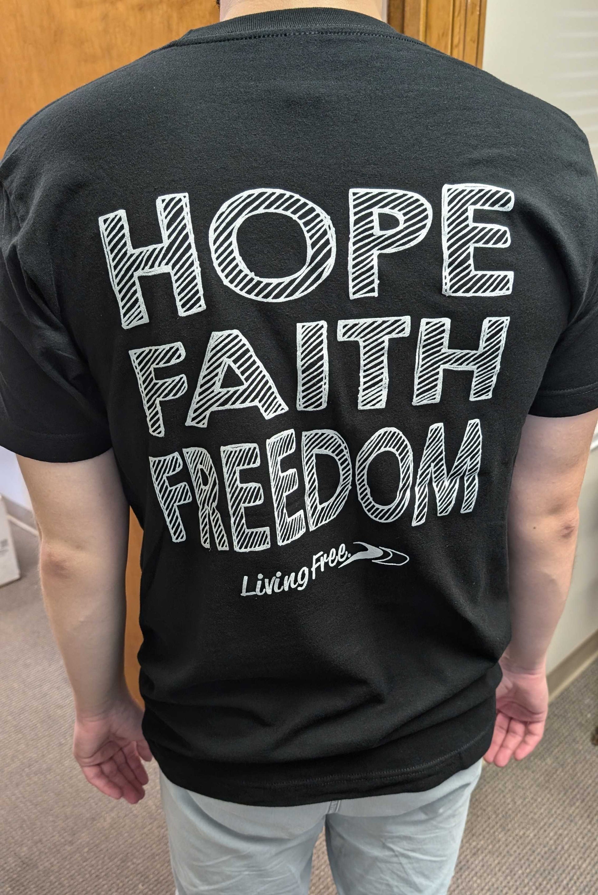 This t-shirt says it all in describing Living Free. We trust that everyone who experiences a Living Free support group receives Hope that tomorrow can be better than today, Faith in Christ, and Freedom from life-controlling problems.